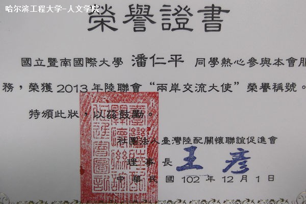 2013年12月1日,我院赴台交流生潘仁平因在赴台交流学习中热心参与服务工作,获得了中华两岸和谐促进会和台湾陆配关怀联谊促进会颁发的“两岸交流大使”荣誉称号。