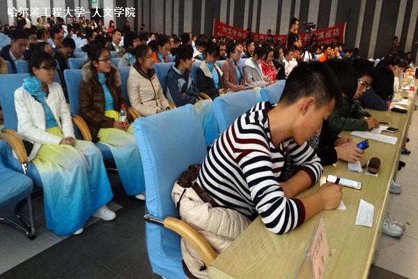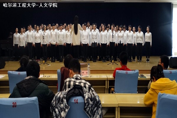 比赛开始,首先由主持人依次介绍,各个院系进行歌曲展示。人文学院与马克思主义学院代表队演唱《十送红军》、《五月的鲜花》两首曲目,男、女生共分为四个声部,层次分明。队员唱功扎实,情感饱满,抑扬得当,不同声部之间配合默契,赢得现场观众的热烈掌声,充分展现学院整体艺术素养。表演过后,评委对各个院系队伍进行打分并排名,排名前八位的队伍将进入决赛。最终,人文学院与马克思主义学院红星合唱团以93.01的高分位居第二,成功晋级决赛。