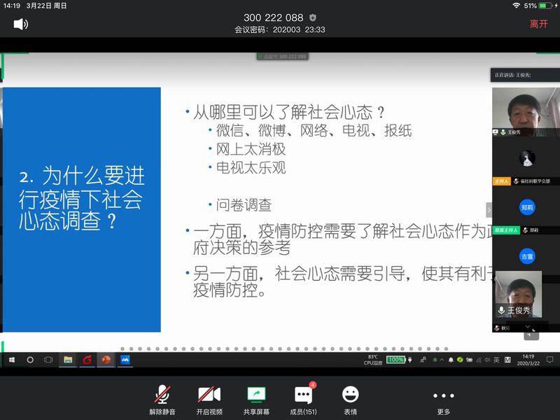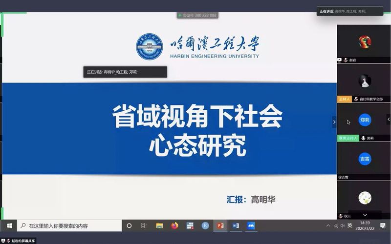 3月22日下午,由省社科联和省社会学学会、省社会工作学会、省社会心理学会联合举行的“黑龙江省抗击疫情的社会支持与信任”理论研讨会,以腾讯线上会议的形式如期召开,会议共邀请5位专家做主题报告,会议历时近3个小时,参会人数达160人。