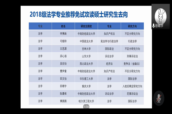 首先,保送至重庆大学的田朝宇同学主要从保研流程进行分享,他以问题为导向展开,对个人夏令营九月推免、未来局势分析进行了详细的讲解。随后,保送至中国政法大学的司银铃同学从学习复习方法、面试准备、投递策略等多方面展开,对同学们日后的面试时间安排也提供了宝贵的建议。然后,保送至中南财经政法大学的李隽姝同学对保研加分政策进行解读,使同学们更加了解保研的类别,也更加明确加分的各种项目和规则。第四位主讲人、同样保送至中南财经政法大学的曹伊童同学进行了详细的保研边缘人策略分析,向同学们推荐了相关的参考书籍和学习网站,并鼓励同学们勇于尝试,调整好心态,学会取舍。
