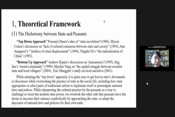 在社会理论分论坛中,尹韬副教授以《嫁接:戏曲与国家法在当代中国的翻译》(Grafting: Folk Opera and the Translation of State’s laws in Contemporary China)为题进行报告。他主要通过对中原地区官方发起的一出民间文艺竞赛的描述和分析,探讨地方政府如何通过演戏的方式来传播法律和政策的过程。尹韬副教授提出“嫁接”这一概念,以反思国家与社会二分的研究框架,并讨论了该概念对于反思中国研究中“转型模式”的意义。来自中韩的相关专家对尹韬副教授的研究进行了评议,并就以下问题进行了交流,如“嫁接”是否也可以用于当下中国政府的道德教化工程,以及农民对于国家的政策宣传的反应等等。