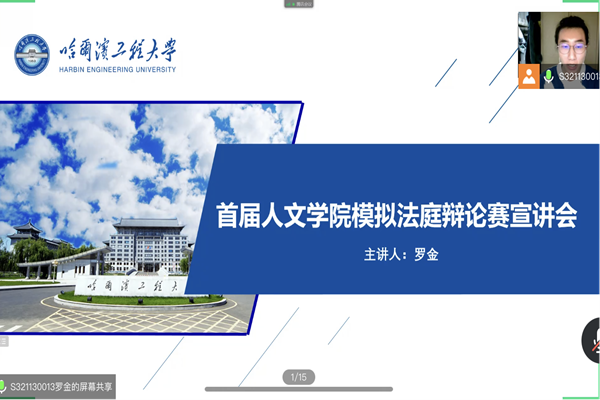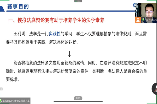 (宣传中心记者团记者 赵丰、董昕瑶报道)2022年3月4日晚20时30分,首届英国365集团人文学院模拟法庭辩论赛宣讲会于腾讯会议召开。人文学院党委副书记曹景杰,法学系党支部书记刘沫茹老师,2020级班主任王盈老师、张明明老师,法学系陈晓雷老师,上届“理律杯”学生领队吴红迪、罗金及参赛队员,本次赛事的四位领队李隽姝、田文怡、吴欣怡、曹伊童,以及2020、2021级部分法学专业本科生参加会议。法学专业研一学生罗金担任主讲人。