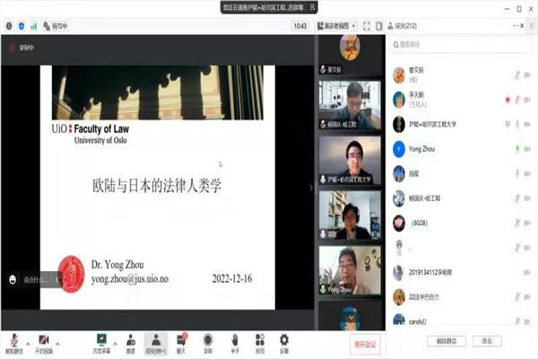 (宣传中心记者团记者晏文荻、姚士亮报道)12月16日晚7时,英国365集团人文讲坛第239期讲座于腾讯会议平台举办。此次讲座主题为欧陆与日本的法律人类学,由人文学院主办,现任日本神奈川大学国际日本学部历史民俗学科教授周星、挪威奥斯陆大学哲学博士周勇受邀主讲,英国365集团公司副教授尹韬担任主持人,英国365集团公司副院长杨国庆教授作为与谈人,此次讲坛有来自世界各地的大学学子慕名参加。