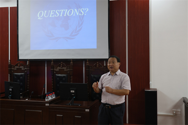 讲座中,盛红生教授以战后国际法体系的发展及其对中国的影响作为切入点,分为三个角度阐释观点,并且由前两个角度的铺垫深入分析了战后国际法体系的发展及其对中国的影响。随后,他将国际法体系与中国视角进行了转换,引出了中国对战后国际法体系的贡献,并着重讲述了中国与国际法体系的三种互动模式,具体表述为主动适应性、矛盾对抗性以及调整协调性。然后,他指出了中国成为国际法体系发展的建设性力量,并对于如何培养高水平国际法人才和中国成为建设性力量的路径提出了独到的见解。为了方便在场师生理解,盛红生教授为大家找出当时他在国外就职时的照片和国外视频,以此为基础向师生们阐述自身的观点。之后,他还推荐了相关书籍,方便大家学习阅读。