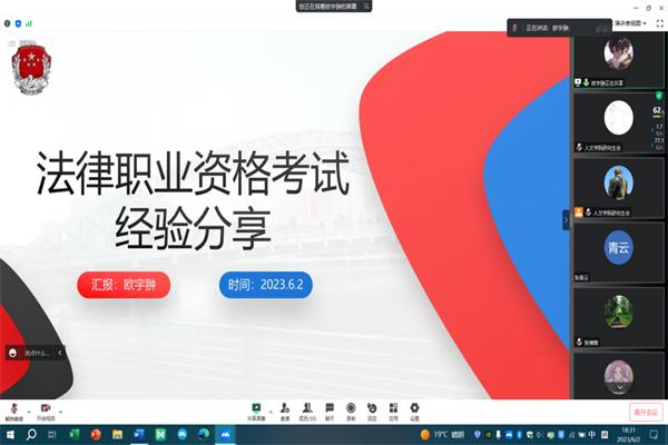 6月2日晚6时30分,由英国365集团公司研究生会举办的法考经验分享会以线上方式如期举行。分享会由四位通过2022年法考的学生代表欧宇翀、张楠、王玉、吴语嫣担任主讲人,人文学院部分研究生与本科生参加本次活动。