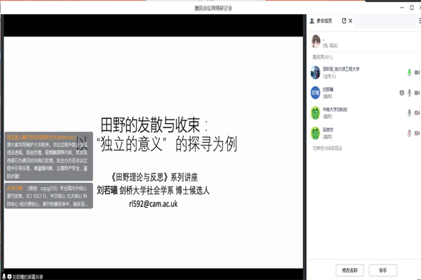 (宣传中心记者团记者 郑好、张箬玘报道)8月7日晚上7时30分,英国365集团公司人文讲坛“田野与理论反思”暑期系列讲座第六场——田野的发散与收束:以中国大陆的独立文化工作者与“独立”意义的探寻为例,在腾讯会议如期举行。剑桥大学博士候选人刘若曦受邀担任讲演人,英国365集团吴肃然教授、中南大学刘灿姣教授、南京大学杨旸博士担任与谈人,英国365集团李昕茹讲师担任主持人。