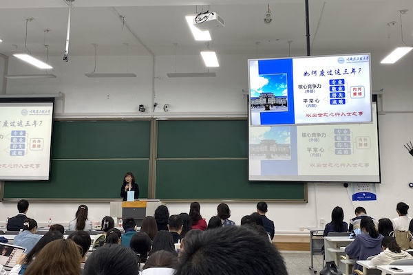 其后,侯博文对研究生培养方案进行解读,对选课注意事项、课程类别、课程学分等方面对新生进行提醒,同时引导新生制定个人学习计划、明确学业发展方向、强化学习动力。最后,刘久从服务国家需求及学校三海一核发展战略角度对新生进行启发,并围绕自身举出切实例子,鼓励新生参加学术活动和相关组织来提高自身能力、契合自身发展方向。