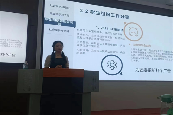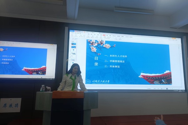 贺惠首先向学生们介绍了专业和学科的教学计划及安排。随后,详细向同学们讲述各专业的课程设置以及教学管理和学籍管理的有关规定。其中,着重强调要熟读人才培养方案以及熟练应用院级网站,这对选择课程及选修学分至关重要。