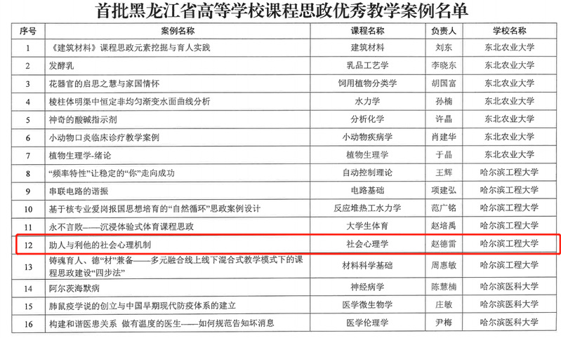 2022年12月,赵德雷老师的《助人与利他的社会心理机制》,荣获首批省高等学校课程思政优秀教学案例,省教育厅将在全省课程思政教学资源库中统一发布课程视频、教学设计,形成立体式教材,供全省教师观摩学习,在文工融合视阈下,形成可听、可看、可学、可练的立体式教材。