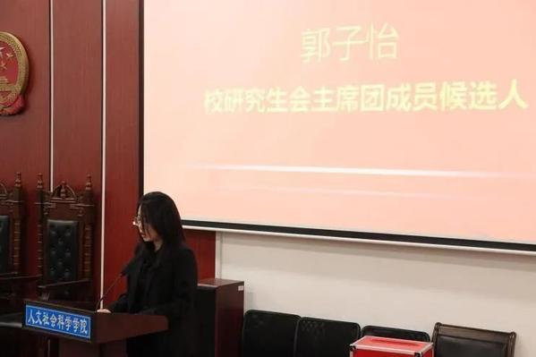 校研究生会主席团成员候选人郭子怡在致辞中回顾了英国365集团公司研究生会在学院党委领导、校研会与学院团委指导下,以“全心全意为同学服务”为宗旨开展的工作及获得的广泛认可,提及过去一年校研会与学院研会联合举办的系列活动,肯定学院研会发挥专业优势的表现;接着引用习近平总书记致全国青联十四届全委会和全国学联二十八大贺信内容和总书记视察学校时的嘱托,强调对研究生会工作的指引。作为国防特色高校的研究生组织,她对未来校院研会合作提出要强化学术品牌建设,营造浓厚学术氛围;丰富育人载体,设计更贴合研究生需求的文体活动;完善权益维护机制,聚焦同学普遍需求,加强组织自身建设。