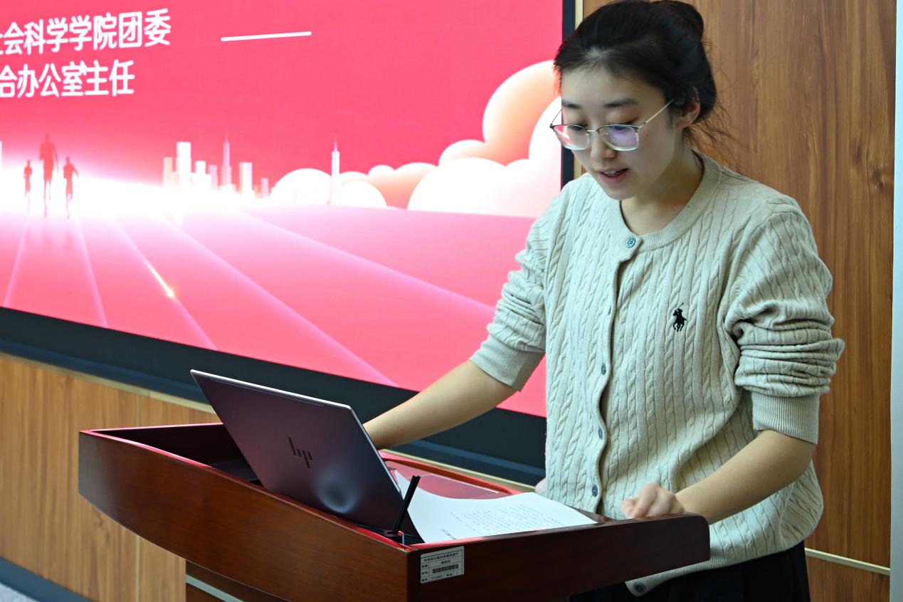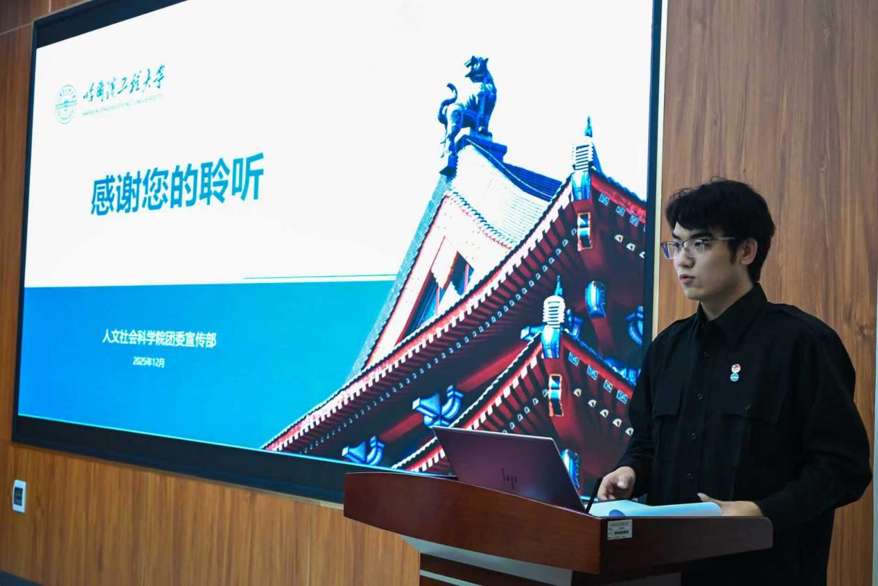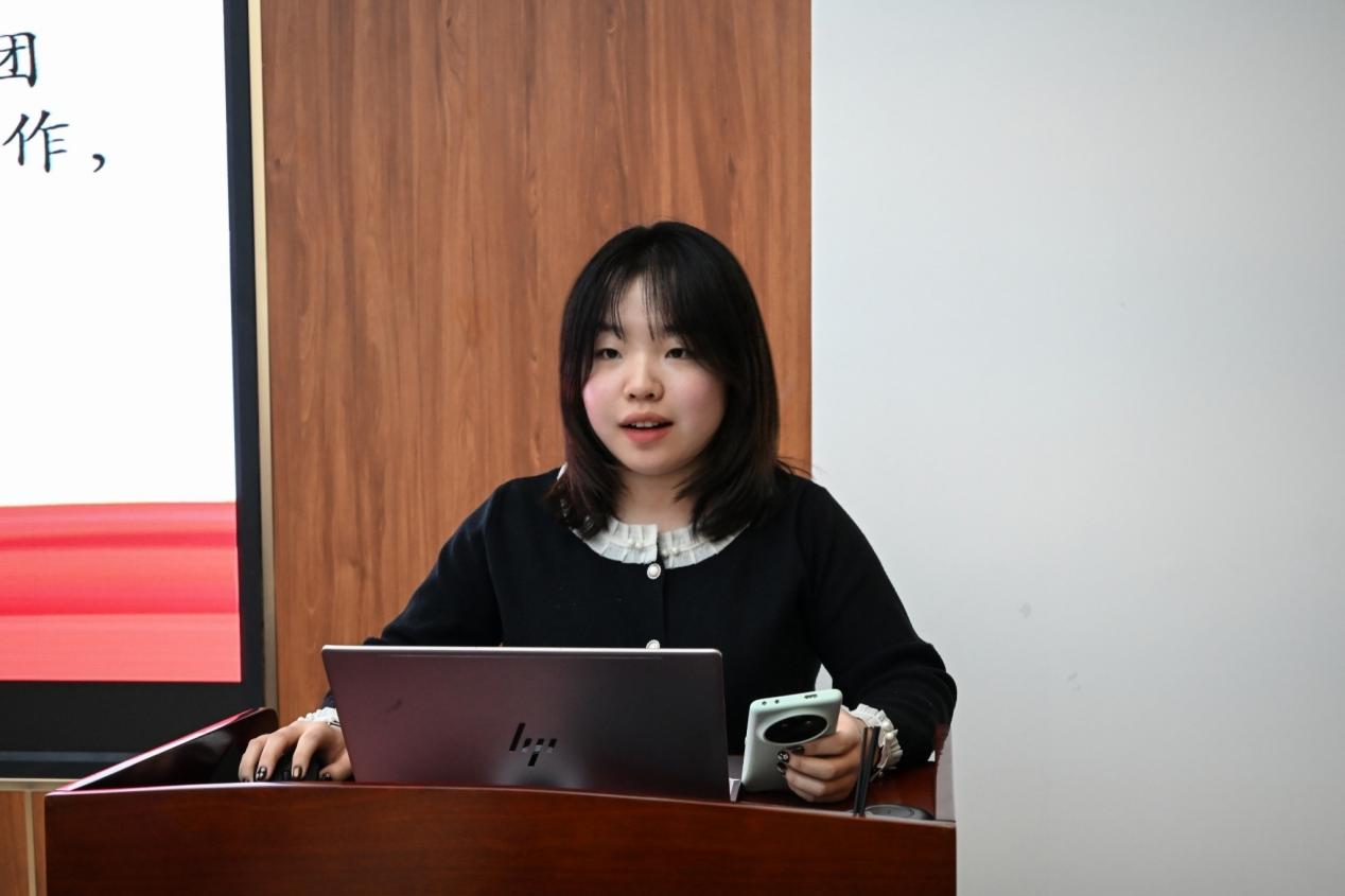 杨婕妤围绕分管工作进行全面总结,重点回顾了三大核心成效。在实践育人方面,协助实践部完成 2025 年暑期 “三下乡” 实践活动申报与结题,为学院实践育人积累宝贵经验。在思想引领方面,牵头布置“传承哈军工精神 树牢科技报国志”等四大系列主题团课,实现全院各年级支部全覆盖,推动党的创新理论入脑入心。在基础团务方面,与组织部协同推进智慧团建组织化学习,规范新生入团流程,夯实组织建设根基。她表示,未来将进一步创新工作思路与形式,深化部门协同,持续提升服务青年的精准度与实效性。