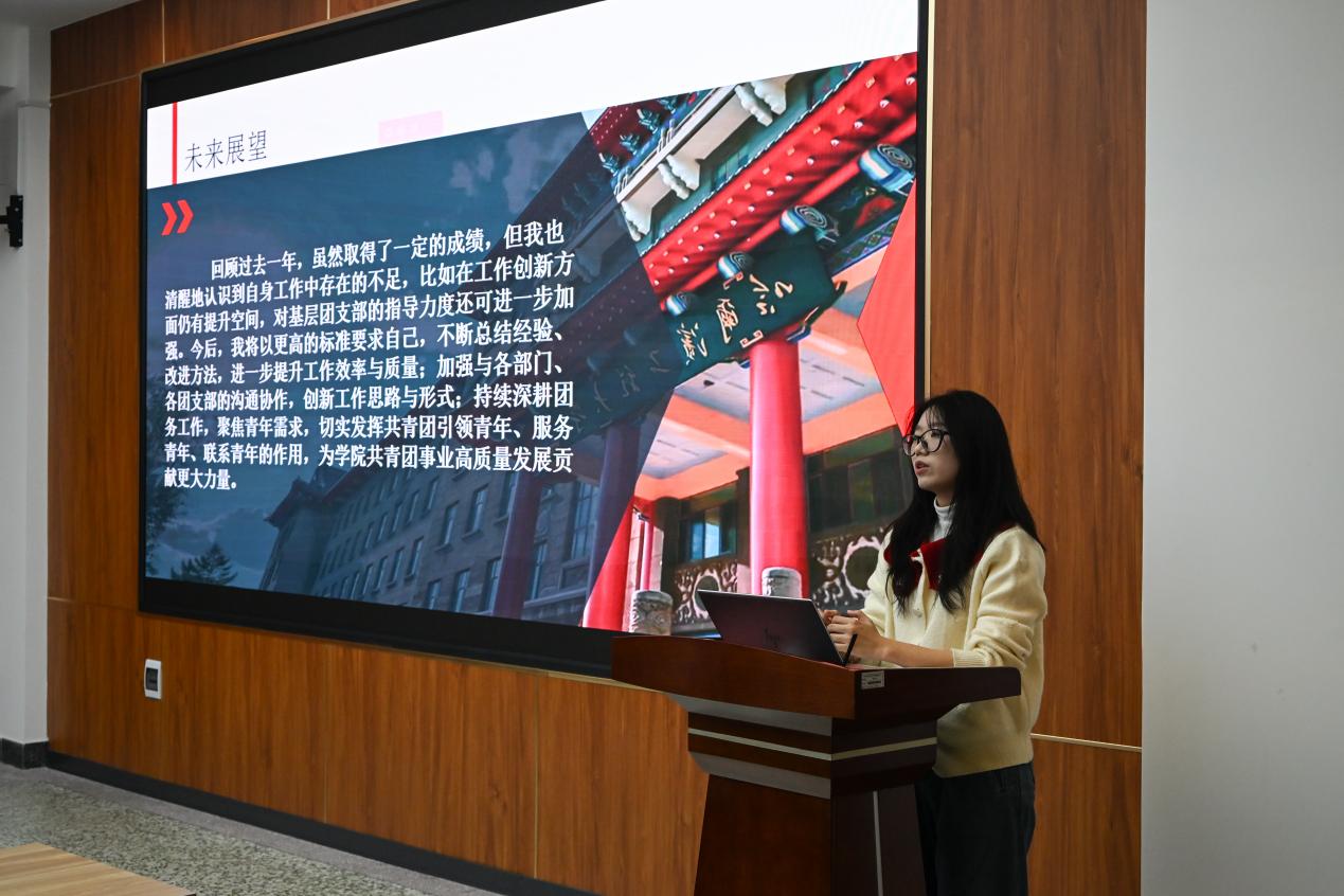 会议伊始,团委常务副书记杨婕妤向全体成员介绍了本次大会的流程与核心意义。2025年是学院团委深耕细作、提质增效的一年,本次大会既是对全体成员辛勤付出与履职成效的系统总结,更是立足新起点、明确新方向,为同学们提供更优质服务、推动团委工作再上新台阶的重要契机,承载着传承初心、续写荣光的殷切期许。